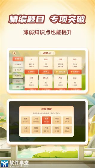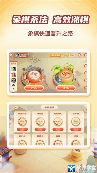 生动的视觉风格,丰富的音效动画,通过下棋或做题获取的经验,还可以兑换特制棋子棋盘等物品,为棋手提供更具趣味性的对弈体验。
