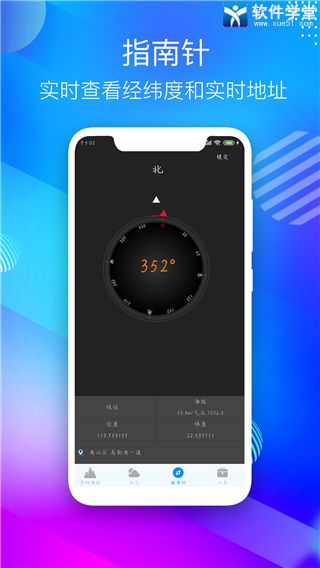 1、指南针:内置指南针功能,让你更快的获取所在地的方向以及经纬度信息。