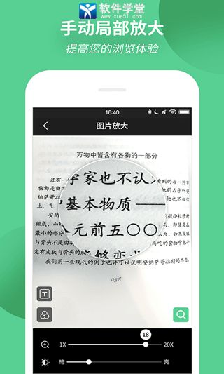 放大镜阅读器app是一款十分简便实用的文字文字查看、识别软件,该软件功能强大,可支持文字图片识取、放大镜、手电筒、屏幕锁定等多种功能,能够很好的帮助将书本模糊的字体变得更为清晰!