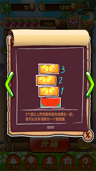 2、三个以上相同颜色面包块组合成甜甜圈,三个以上甜甜圈组成一个巧克力甜甜圈,三个以上巧克力甜甜圈组成双可可甜甜圈,三个以上双可可甜甜圈组成双层蛋糕;