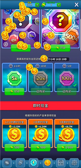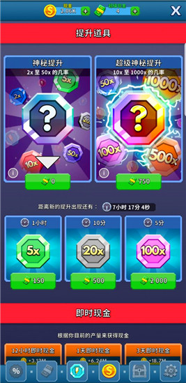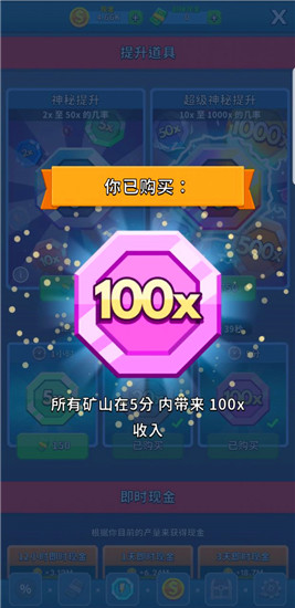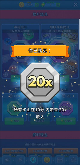 3、电梯运输和地上的运输工需要480个金币才能进行升级,可升级运输速度,运输量,运输工人数等等。在玩家们攒够金币后即可开始升级。当经理头上出现小锤子的图案时,点击小锤子可以对开采的矿工进行加速,不过只有60秒的加速时间。黄色的矿工的箱子里最多可以装1k的金币,电梯的也是,地上推小车的矿工也同样。把屏幕往下滑,下面都是未开采的矿区,矿区2在你收集到1k金币后就可以开启。所开放的矿区越多,你收集的金币也就越多,当你雇佣了经理后,矿区就会一直开采,你离开游戏以后,矿区经理会进行监督,你回到游戏界面以后点击收集,你离开是所开采的金币就会全部被收集。