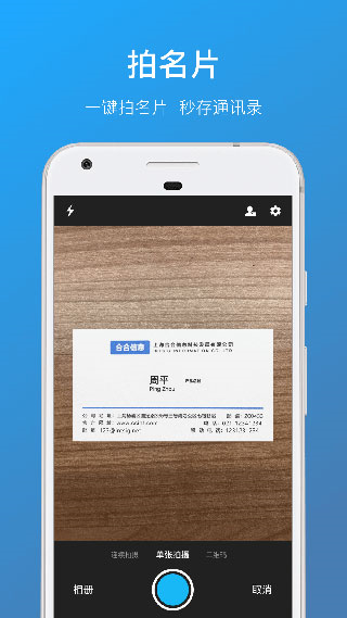 手机拍照,就能自动扫描并精准识别名片上的信息,快速保存到手机通讯录。