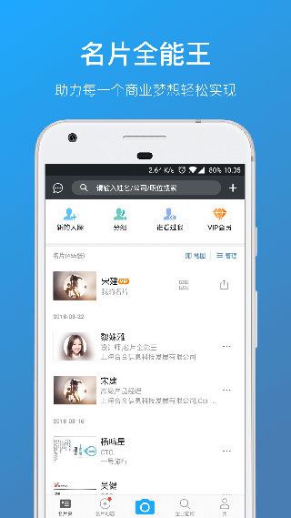 名片全能王app是一款十分便捷好用的商务办公软件应用,软件页面设计简洁清新,功能丰富多样,可帮助用户一键智能识别扫描名片信息,并为您进行智能信息管理,方便用户可以更好的拓展商务人脉!