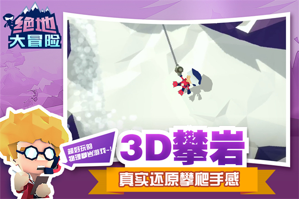 绝地大冒险。让你足不出户体验在雪山上攀岩的快乐,在游戏中会有多个关卡救援任务引导你前进,雪山之中危险重重,会有突如其来的猛兽,会有让人措手不及的雪崩,会有从天而降的碎石等等,但是救援任务必须完成,责任感与使命感在驱使你前进,装备一应俱全,出发的过程中会有直升机将你送到事发地点,登山之路有冰锥和碎石,还有羚羊,等待救援的人在石缝之间站着,一步一步的向上爬的过程中抓过的石头和冰锥随时都有坍塌的风险,所以要临危不惧,迅速转移抓取位置,随机应变,灵活走位,即使不小心掉了下去也不要担心,找准时间,在跌落之际绝处逢生,这个游戏就是可以给你带来很多的奇迹,它以卡通的形式模拟壮阔的雪山画面,形象而生动,确实很不错,快来下载绝地大冒险,和我一起体验雪山救援的乐趣吧!