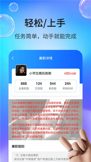 4、轻松赚取生活费:实现”每天半小时,月赚1000元”的小目标。 生活中的棘手、为难事情,都可以在牛帮APP发悬赏来解决。