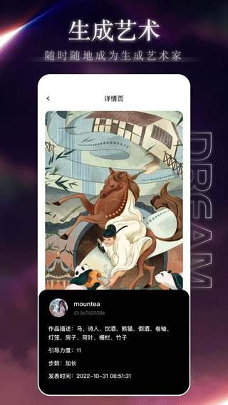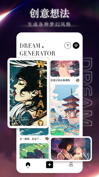 梦境生成器app是一款极具特色的ai智能绘画生成软件工具,在这里大家不需要拥有什么专业绘画技巧,只要你要创意、有想法就可以轻松成为一名绘画大师,创作出专属于你的特色创意画作!