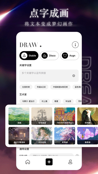 创作出极具创意特色的精美画作。这是一款非常好玩又有趣的特色创意ai智能绘画生成软件,虽然该软件占用内存不大,不过功能丰富多样,简单易上手的使用操作,让大家只需输入你想要绘画的各类画作关键词,绘画风格、效果即可一键轻松为您呈现一幅幅精美创意绘画作品,非常的简单有趣,感兴趣的朋友可以来试试。
