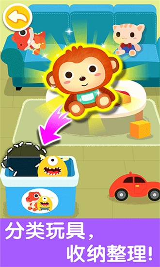 宝宝爱整理游戏是一款可以让宝宝学会整理的益智小游戏,让宝宝在做游戏的过程中学会打扫客厅、卧室、厨房、整理房间等,锻炼宝宝的动手能力。该游戏通过模拟现实生活中的场景,让宝宝学会一些简单的家务活。打扫客厅要让他学会通过分辨颜色来整理,把不同颜色的玩具放进相应颜色的收纳箱内。整理书房是让他学会用具分类,要将看过的书,用过的玩具都要分类摆放整齐。打扫卧室要让他整洁、爱干净,把脏衣服都放入专门的篓子里,把衣服分类叠起来,床铺的被褥铺好,最后将充满灰尘的卧室扫干净。清洁厨房是让他学会对食材进行分类,要帮忙把蔬菜水果牛奶等分类放进冰箱,然后把厨房打扫干净。宝宝爱整理游戏非常适合三岁以上的小宝宝,让他们在游戏中学会干家务活,养成良好的生活习惯。如果你家也有小宝宝的话,就赶紧下载吧。