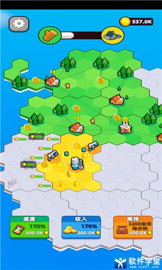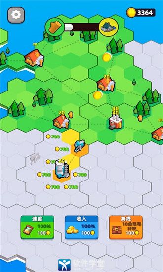 3、你的资源可以不断的进行扩张,达到一定程度后,会有新的升级内容出现,下面会显示速度、收入、离线,花相应的金币都可以提升生产效率,从而更快速的扩建你的领地