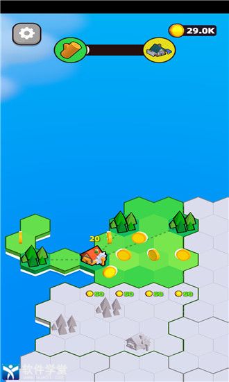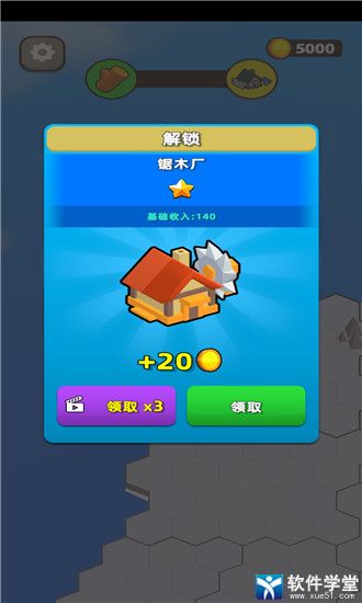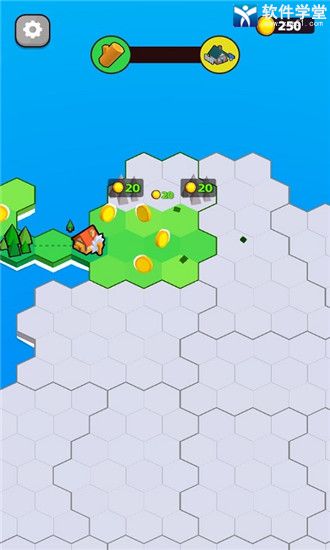 2、消耗金币可以扩建你的领地,金币数量可以从右上角查看。橙色小房子的图标说明你可以解锁树木、矿产、建筑等资源
