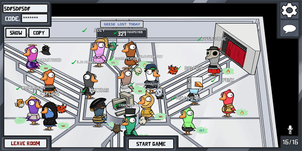 所有玩家中只有鸭子,他必须在计时器用完之前杀死所有的鹅。鹅可以通过完成各种不同的任务来减少计时器。活鹅任务完成将使计时器减少 4 秒,死鹅任务完成将使计时器减少 1 秒。您也可以躲避杀手鸭,让计时器用完来赢得比赛。