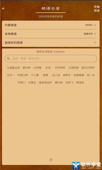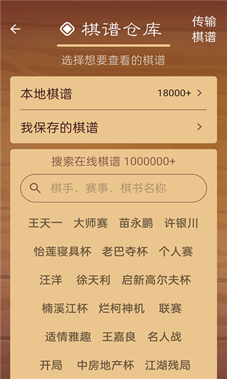 这个模式中我们搜索想要的棋谱,也可以从本地导入棋谱,还可以查看自己保存的棋谱