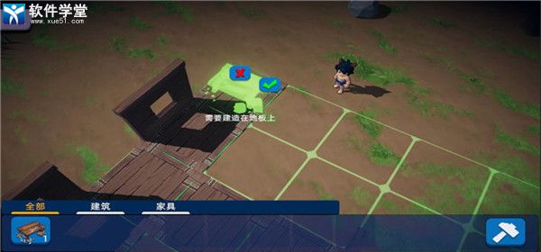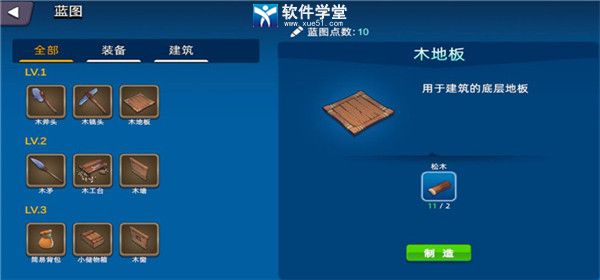 3、采集了资源之后,大家可以点击小锤子按钮,打开蓝图,先做一个木地板,因为工作台之类的建筑必须要放在木地板上面才能使用,所以一定要先在地面上铺上木地板。