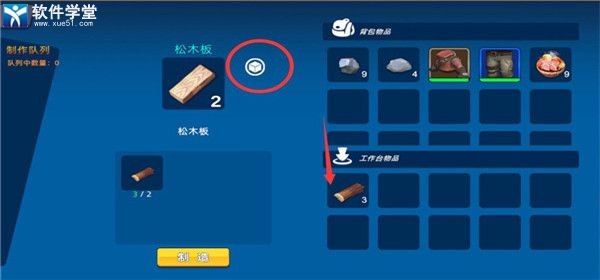 5、工作台的使用:大家可以点击物资,选择放入工作台的储物箱,然后点击左边你想造的物品进行制造。造完了之后可以点击那个白色的图标,拿取工作台已经造好的物品。