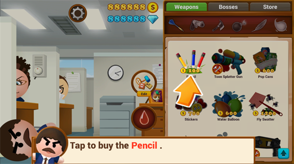 玩法很简单!选择想用的工具,对着老板往死里扔,往死里打!游戏的玩法提示很充足,可选的工具很多,抖S们兴奋吧!小到图钉、黑板擦、铅笔、贴纸美工刀,大到钉枪,针筒竟然还有汽车,病毒马桶揣子,和黄脸婆!(哈哈,果然老板怕老婆!)不过每一种用具都是需要花金币去买的。有的还需要充值才可以买!