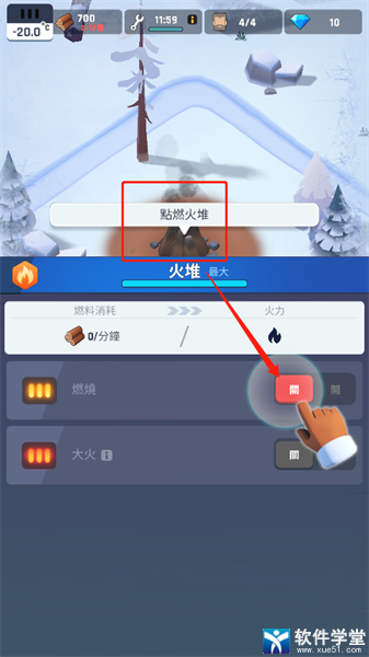5、当夜晚降临,气温骤降,达到不适宜的温度时,我们需要将大火的火力切换为最大,以保持合理的生存温度