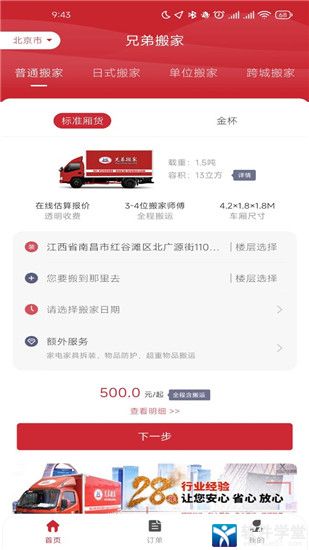 填入预留信息,选择额外服务,在线估价起步价500元,超公里收费每公里8元,其余收费标准参考普通搬家