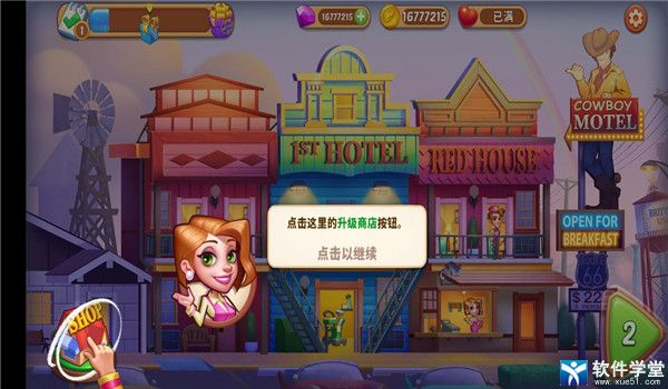 7、当然你的目标远不止此,玩家最终的目的是要将整个酒店打造成全球最着名的酒店,现在尝试去升级商店看看吧!回到主界面,点击左下角房子升级图标