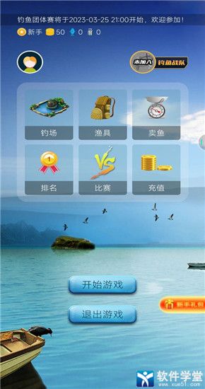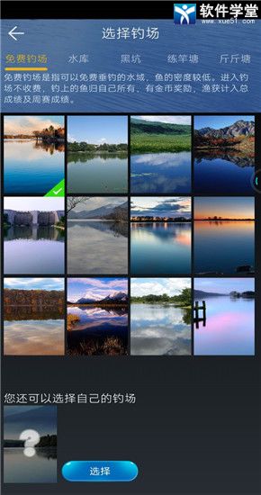 3、返回主页面后我们点击钓场可以选择自己喜欢的钓场,新手建议就在免费场钓,我们可以点击选择的钓场直接进入游戏开始模拟钓鱼