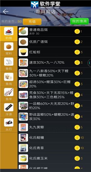 进入到游戏后,游戏会赠送普通商品饵*30,小中大号鱼钩(1+2+2),普通鱼线*2,3.6米台钓竿*1,9目普通小号浮漂和一个头灯以及金币*50