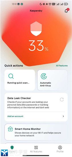 卡巴斯基杀毒软件手机版全英文界面使用起来会稍有不便,但是整个页面整体布局让人看着舒心,你可以按图标样式猜测具体功能,比较符合常规逻辑,部分功能需要付费开通账户才可以使用,常规扫描查杀不需要,感兴趣的小伙伴可以下载体验一下。