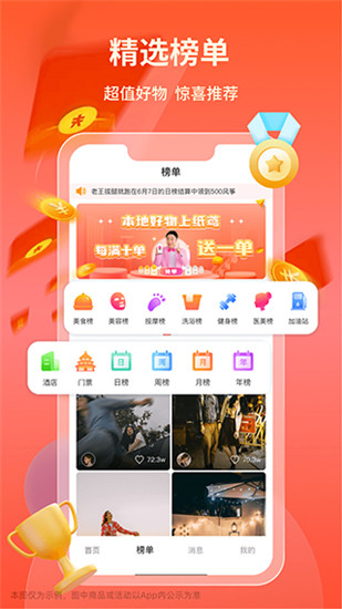 2、榜单页,软件会按照你所提供的定位权限给你推荐附近的生活榜单,如美食、