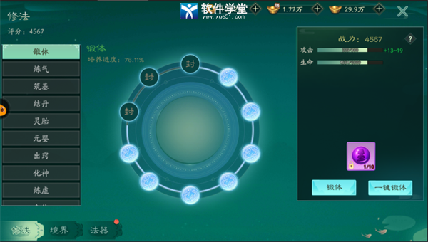 7.元神,玩家通过使用渡厄丹锻体提升自己的境界,在后期增加战力幅度会越来越大。