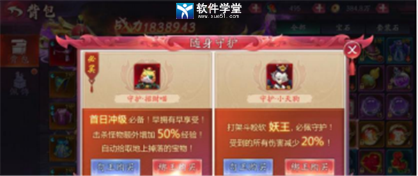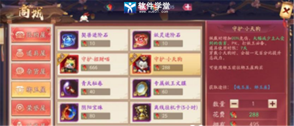 守护灵招财喵:380点勾玉或666点绑定勾玉购买,可以为角色增加50点防御,50%的杀怪经验加成,自动拾取功能