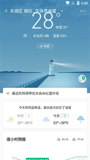 天气变幻无常,总是令人捉摸不透?不用担心,快来下载彩云天气预报app手机版软件,可实时为您播报最新天气情况,让你再也不用担心刮风下雨,令人措不及防了。这是由北京彩彻区明科技有限公司精心研发打造的一款专业天气预报软件应用。软件功能强大,拥有强大精准定位功能,可根据用户定位城市为每天实时为您提供当地天气气温数据信息,并逐小时播报天气情况,让你可以实时了解掌握未来24小时的天气变化。而且根据不同天气情况,它还可以自动为您推送更多生活服务建议,致力于带给你更好地生活服务体验。
