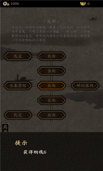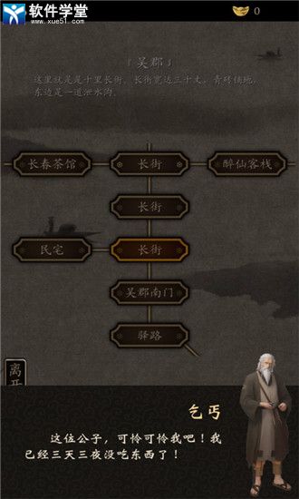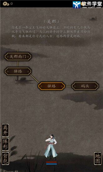3、然后进入到吴郡地图内,玩家在这里点击不同的地方都会有解析,这种方式还是比较新颖的。比如你点击驿站,上面会显示你走在一条尘土飞扬的大驿道上,不时的有几匹快马从身边飞驰而过,马上的骑手的背上都佩带着刀枪剑戟,看来都是些习武的人士,道路两旁是树林。