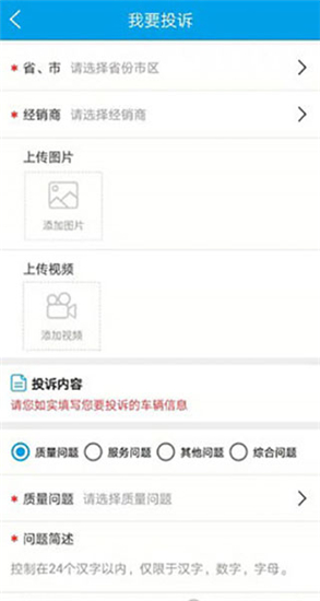 2、然后输入详细的车辆品牌信息和问题原因,可以拍摄图片也可以拍摄视频进行投诉。