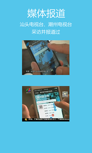 5、汕头电视台、潮州电视台分别于2015年、2016年报道过开发者的“潮州音字典”。