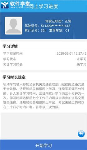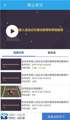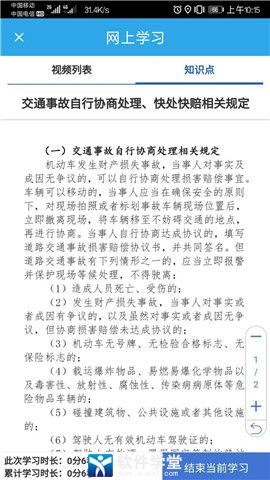 8、点击“知识点”,查看当前视频知识点,在查看当前页面时,开始计时。每次连续学习五分钟以上的计入累计学习时间,三日内累计学习满三十分钟为一次,学习时间达标后七个工作日内可以申请参加道路交通安全法律、法规和相关知识网上考试,考试未通过的可以在二十四小时内补考,补考以二次为限。