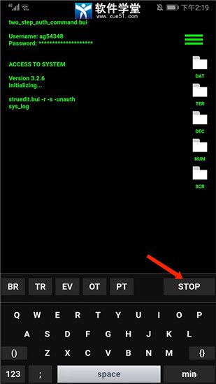 3、可看到代码编辑界面会自动输入并且滚动代码,我们点击【STOP】选项,即可暂停自动输入,