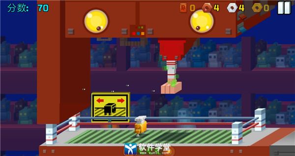 玩家要小心避免被拳头击中,方法也很简单我们只需要注意两个方面即可,一是控制传送带的移动方面,点击后就会改变其向左或向右的传送;另一个则是预判,当压降机即将下压时,会出现感叹号的提示,这时候及时作出回避反应或改变方向,即可躲避。