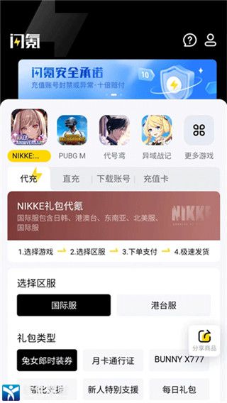 2、ID直充,十倍赔付,多重安全保障,游戏购物就上闪氪。