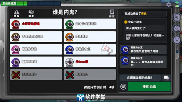 3、语音交互功能,每当玩家发现另一名玩家死亡时,可以点击报告,剩余存活的玩家都会被强制拉到一张桌子上开会,讨论自己已知的情况进行推演其它阵营的玩家是谁。