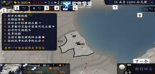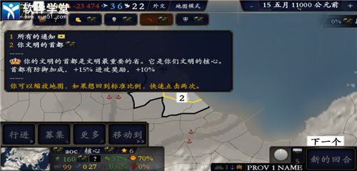 2、你将会拥有你的文明首都,同时你需要掌握所有的通知,你可以放大缩小地图,双击可以回到标准比例
