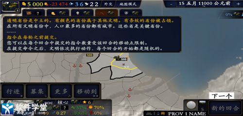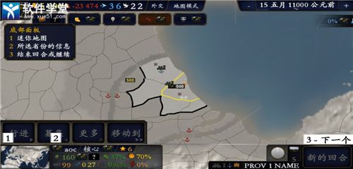 4、底部面板中有迷你地图,所选省份信息和解锁回合或继续,掌握这些内容之后你就可以开始对战了
