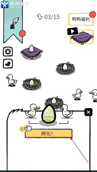 休闲养成类游戏,游戏的玩法非常的简单,就是通过点击不断的孵化鸭蛋,不过随着鸭子的数量越来越多,新出生的鸭子会发生基因变异,变异的鸭子也会不断出现,有的头上长满刺的,有的由猪头鸭身组成等,看上去非常的有趣。游戏中将鸭子的等级分成了普通,稀有,史诗和传奇这四个等级,普通属于孵化概率最大的一个等级了,不过场景的容量是有限制的,当达到上限之后就无法继续孵化了,因此我们可以适当的舍弃一些普通的鸭子,以此来腾出空间孵化新的鸭子。在游戏中,有一个神秘的洞穴,我们可以将舍弃的鸭子丢入洞中,一来可以腾出场景的空间,二来可以增加孵化更高等级鸭子的概率。