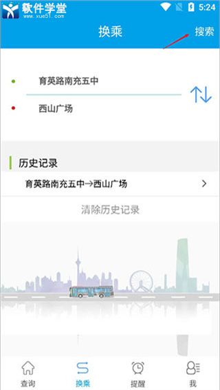 3、在换乘页面中,输入起始位置和终点位置,随后点击右上角的搜索就可以查找相关线路信息