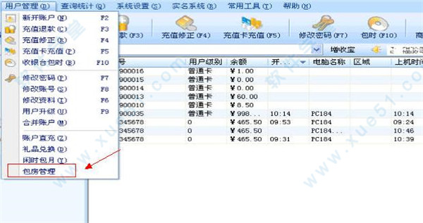 3、收银台操作A、在用户管理菜单内有一项新增的“包房管理”,如下图,点击进入后,能查看到当前网吧所有包房信息。