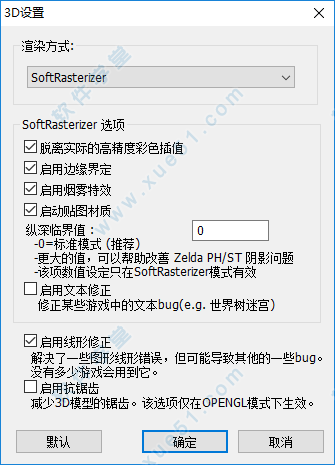 设置-3D设置,该项设置是Desmume的核心机能,必须勾选的选项是Enable Textures(使用贴图纹理),不勾选的话游戏中会出现贴图错误。建议勾选Enable Line Hack(使用线性过滤),增强模拟画面效果。渲染选项可以选择OpenGL,一些显卡不支持OpenGL,可以选择SoftRasterizer。