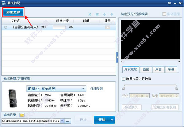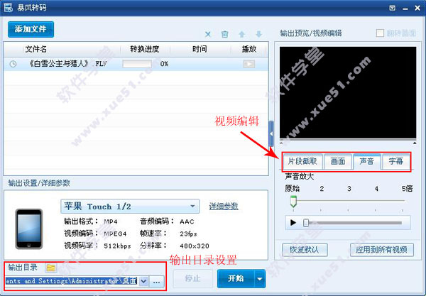 3、格式选择完成之后,回到软件主界面,在软件的右边具有视频编辑功能,其中包括,视频截取、画面裁切、声音缩放及添加字幕等几项功能。不需要的朋友,可直接设置文件的输出目录。