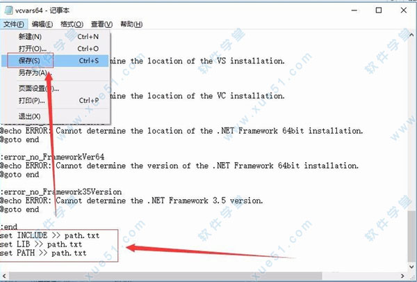 2、弹出vcvars64的文本后在:end下一行输入图中红色框出来的部分,之后在进行保存操作。
