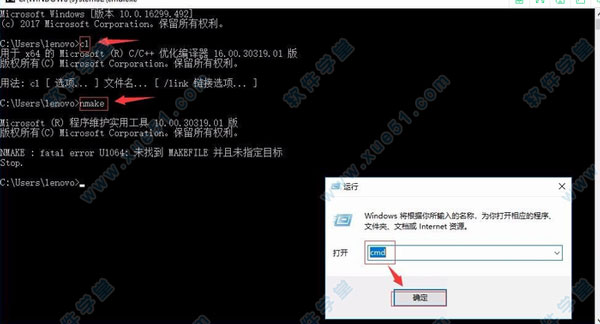 8、同时按下菜单键+R键,打开运行窗口。输入cmd,点击确定,打开cmd.exe。在cmd界面输入cl之后敲回车键,再输入nmake之后敲回车键。显示图中所示表示环境变量设置好了。