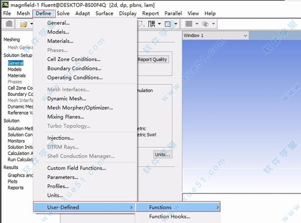 9、以上步骤是对UDF的环境变量进行修改,如果UDF的环境变量没问题,上面的步骤就不用看了。打开软件,依次点击“Define”>"User-Defined">“Function”>"compiled"。准备对UDF文件进行编译。