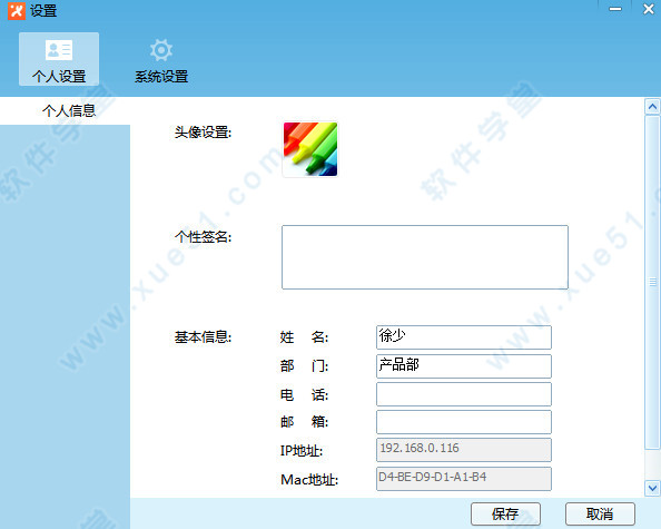 1.通过“个人设置”,用户可以自定义头像、修改签名、姓名、部门等信息,点击保存后,局域网用户可以查看到您设置的信息。