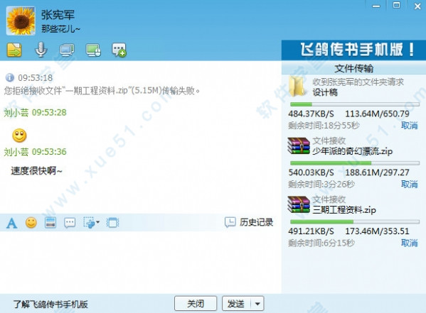 飞鸽传书对文件传输做了很大的用户改善,除了可以通过聊天窗口选择发送文件,还可以将待发送文件直接拖到好友列表的头像或聊天窗口内实现发送。