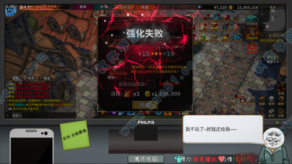 游戏设计巧妙地模拟了我们现实里网游的氪金机制,每到关键的时候,玩家的进度都会被卡柱,这时就只能通过氪金来解决。而且,在这款游戏中,等级、伤害、装备等传统网游中的重要元素都被简化了,玩家只需要通过氪金就能不断提升战力,而战力的提升又会直接拉高玩家的伤害输出。当然这并不是要你“真的”去氪金,中国式网游游戏内设置了打工赚钱进行充值的机制,所以玩家是可以通过操控角色在游戏中打工赚钱的,然后去网游中充值来提升自己的战力数值。